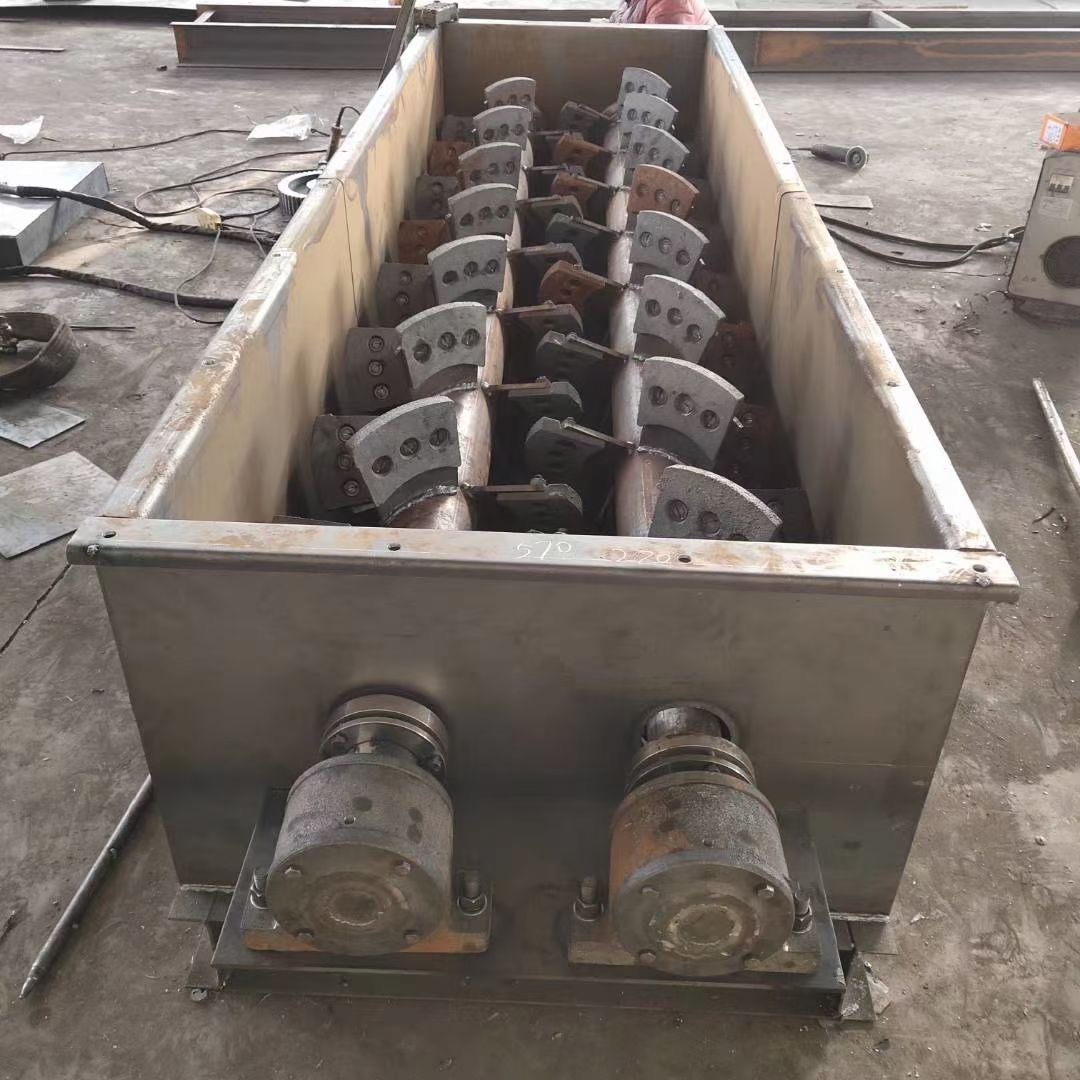 雙軸攪拌機采用擺線針輪減速器傳動,轉(zhuǎn)動平穩(wěn),噪音低。雙軸攪拌機從頂部進料,底部排料,結(jié)構(gòu)合理。雙軸攪拌機各結(jié)合面之間密封嚴密,運行平穩(wěn)。雙軸攪拌機屬于白落式攪拌,設(shè)有加噴水系統(tǒng),保證噴水均勻,調(diào)節(jié)供水量來滿足需要。雙軸攪拌機采用手壓油泵集中供給四個傳動軸承潤滑油脂,方便設(shè)備的使用維護,雙軸攪拌機采用兩組螺旋葉片進行攪拌,具有攪拌效率高、占地面積少,螺旋葉片采用高耐磨特種合金或復(fù)合陶瓷,使用壽命長等特點。